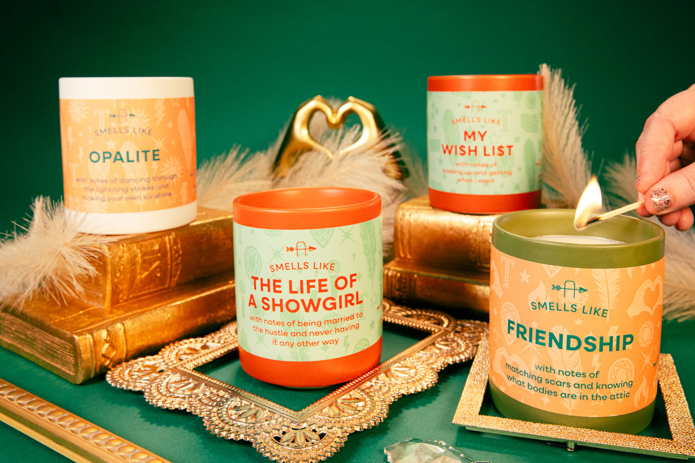 Introducing FOUR new Swiftie candles: Smells Like ... The Life of a Showgirl, Opalite, Friendship and Wish List. All feature our newest scent: Showbiz Santal.