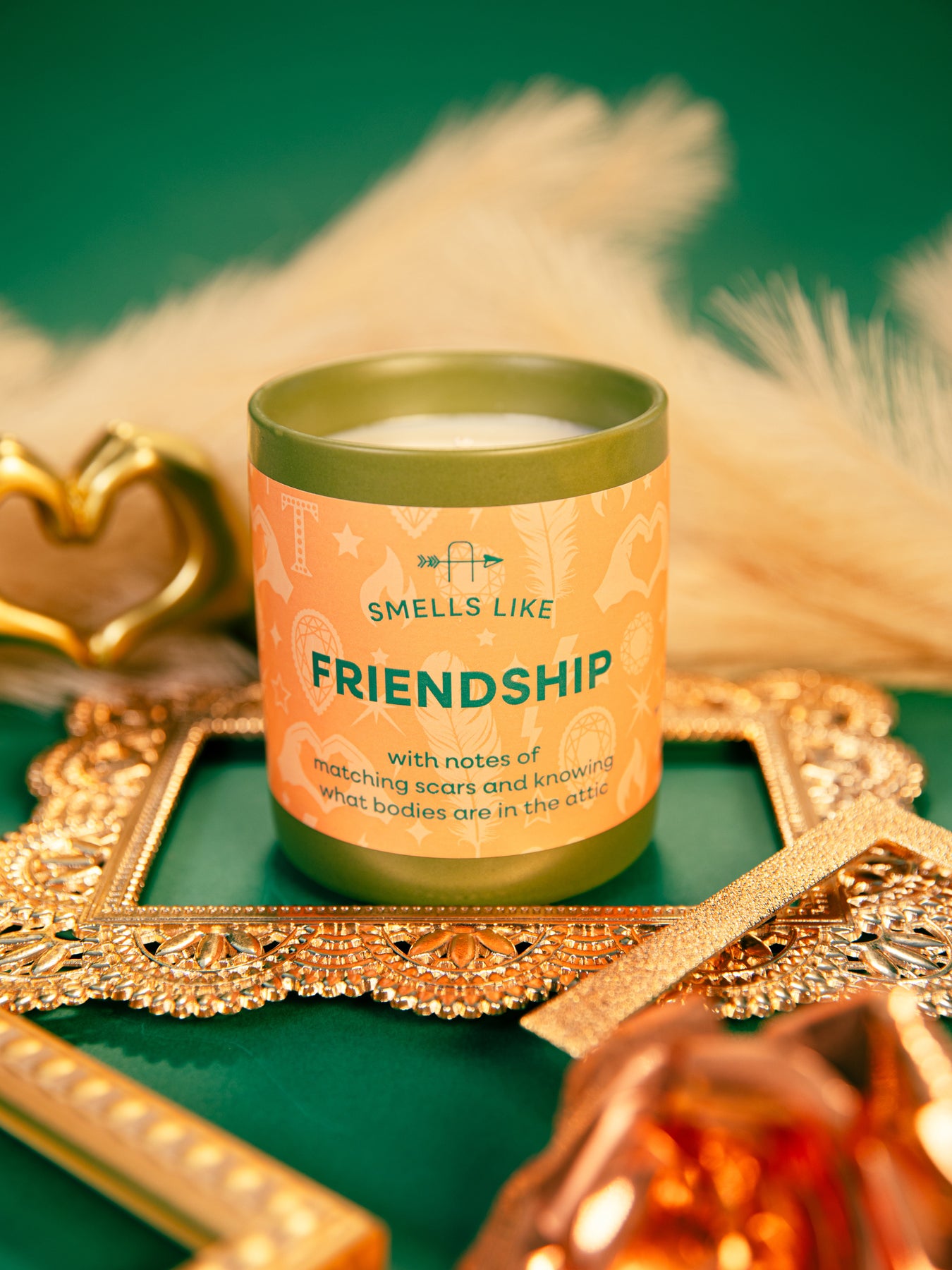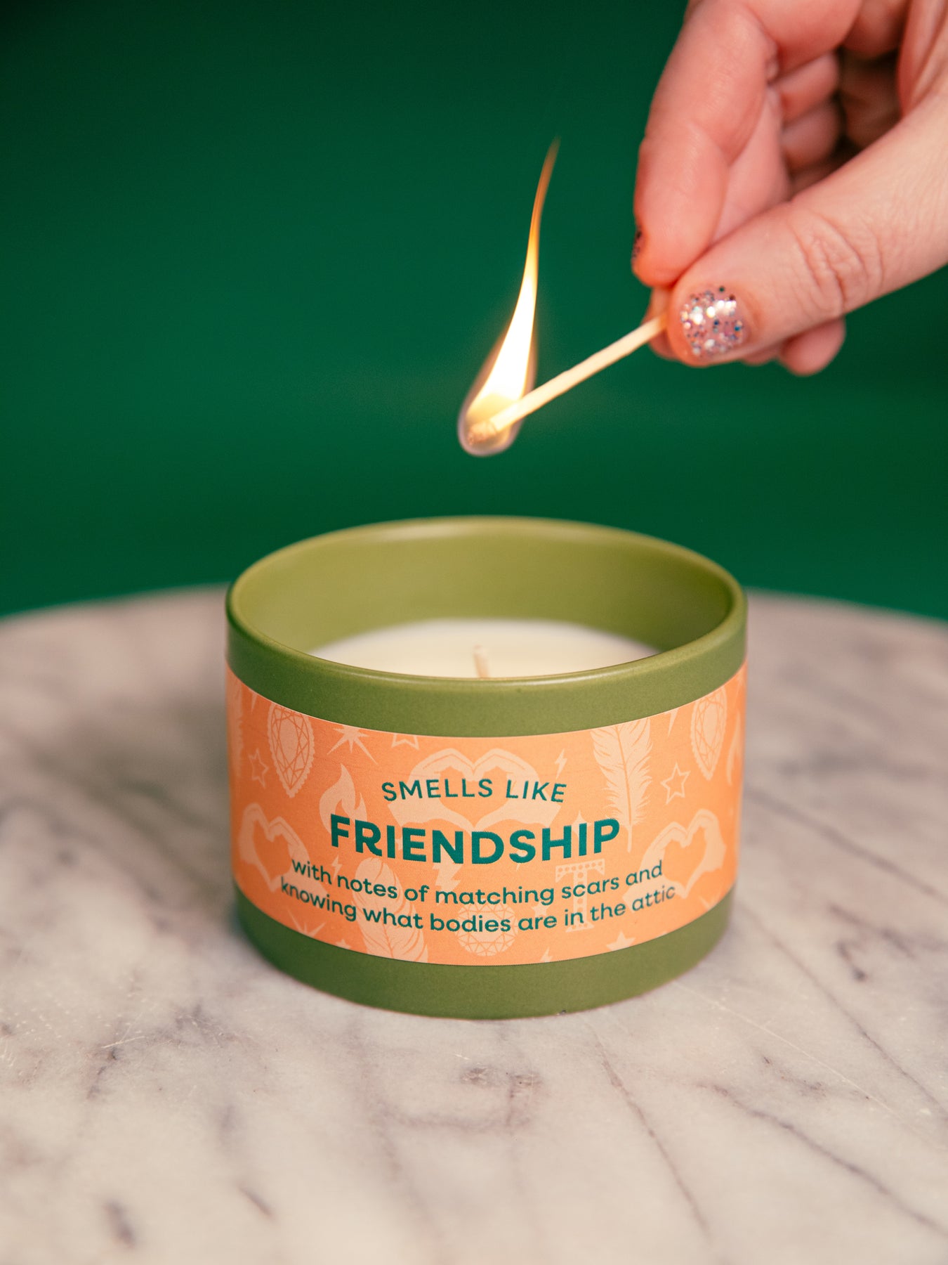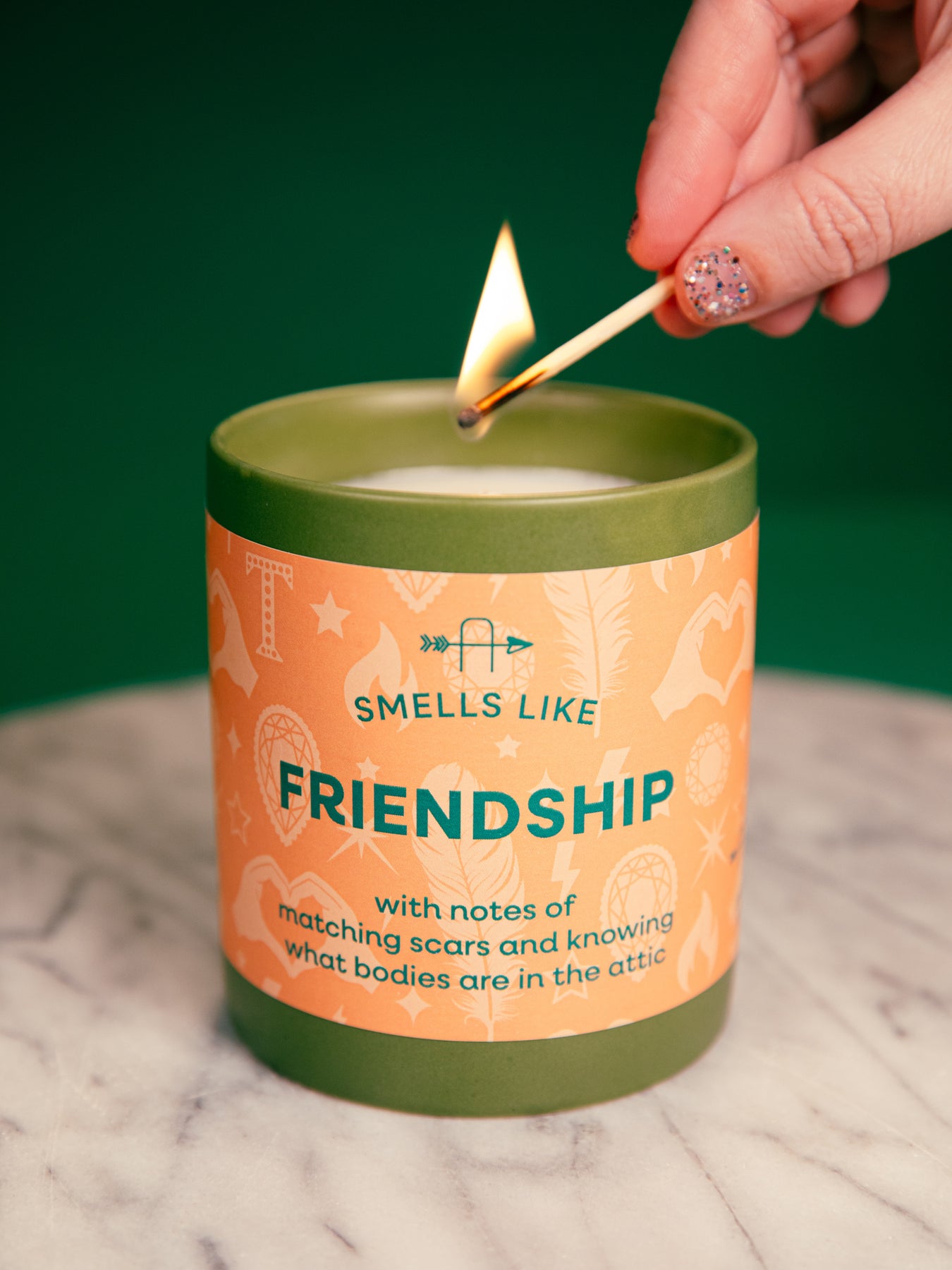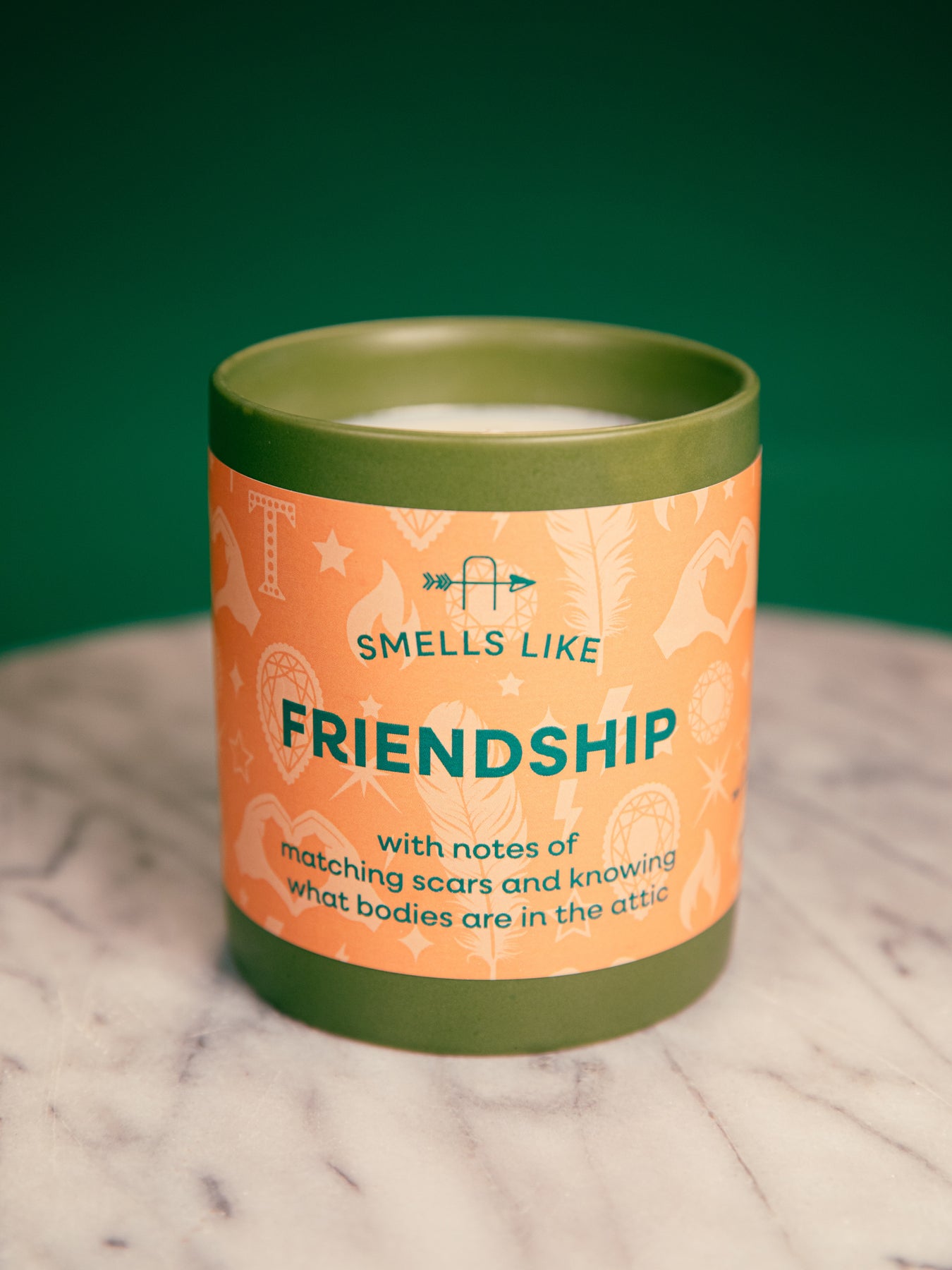 Smells Like Friendship TS candle, with notes of matching scars and knowing what bodies are in the attic. Inspired by "Cancelled" from Taylor's 12th album, The Life of a Showgirl. Adorned with a soft orange label illustrated with showgirl feathers, sparkling diamonds, gems, heart hands, stars and lightning strikes; housed in a green ceramic tumbler. A perfect gift for any Swiftie looking to light up their space with a playful nod to Taylor’s latest album.