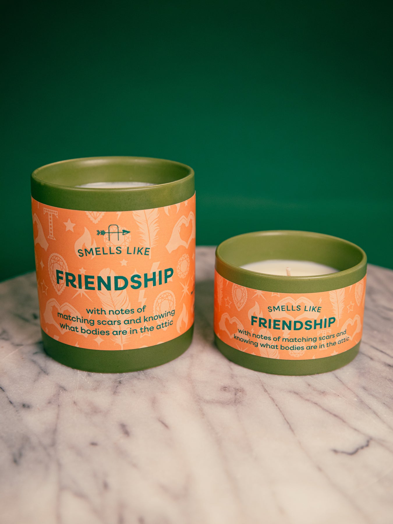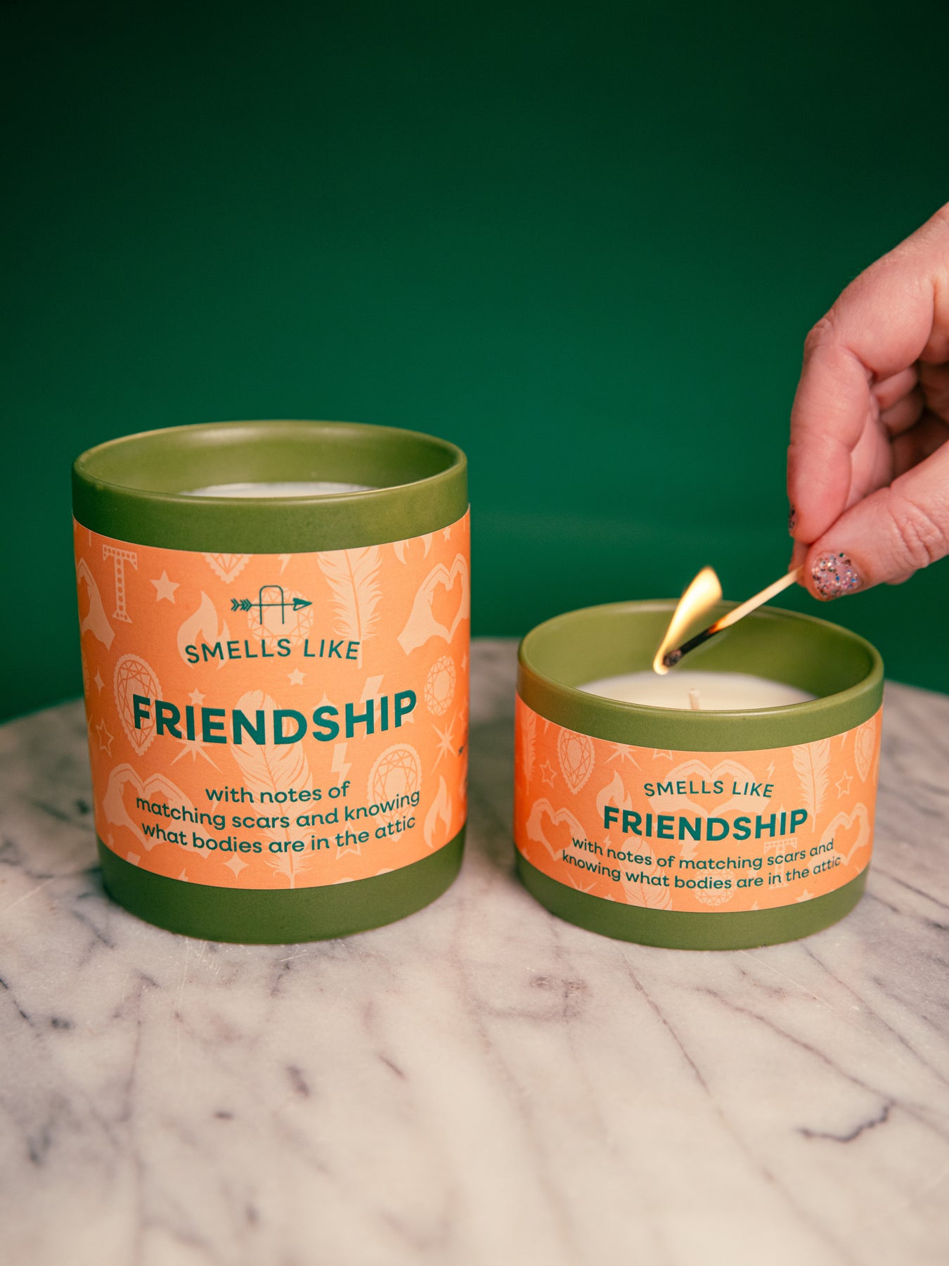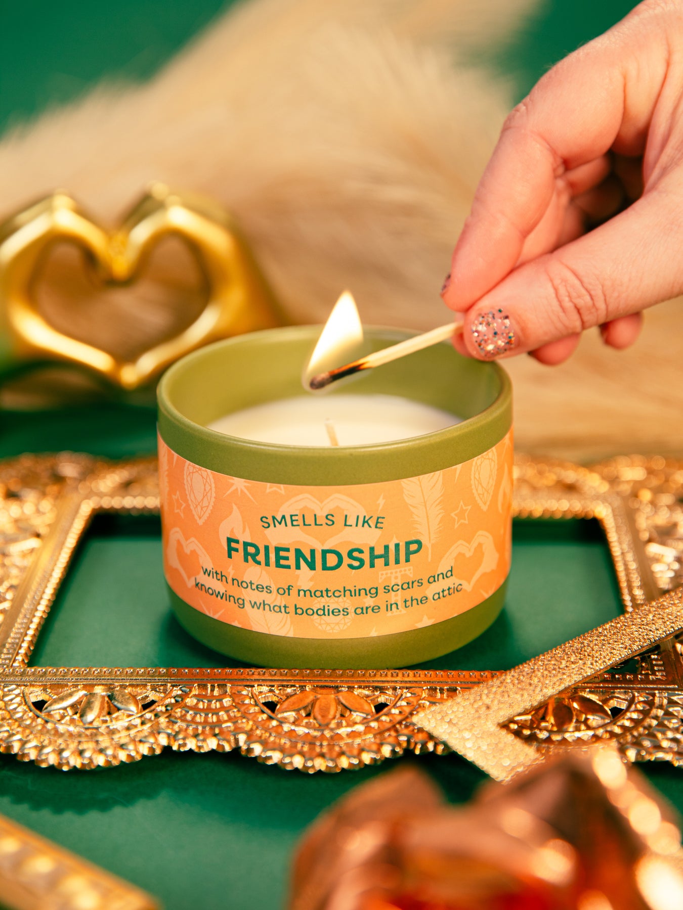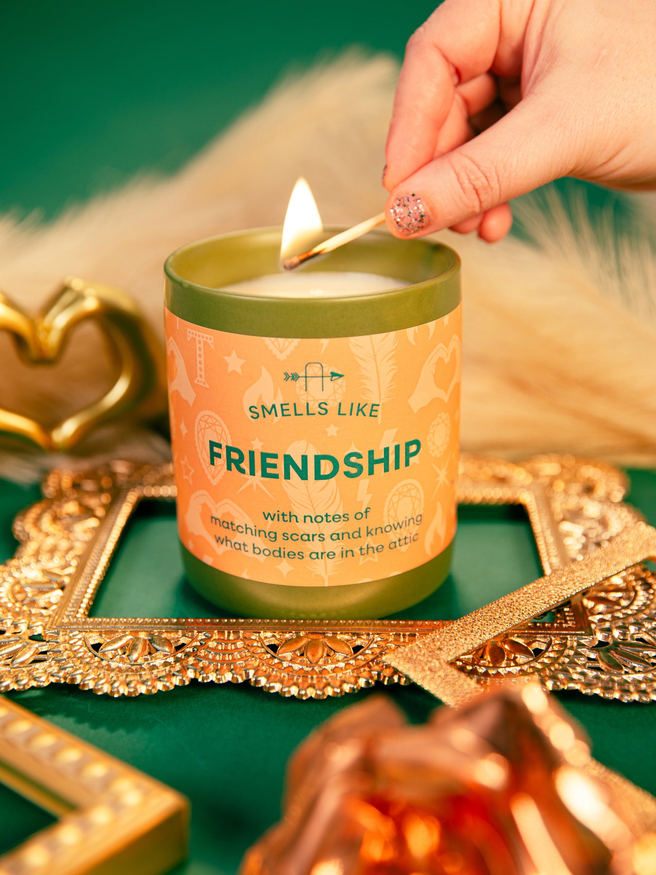 Smells Like Friendship TS candle, with notes of matching scars and knowing what bodies are in the attic. Inspired by "Cancelled" from Taylor's 12th album, The Life of a Showgirl. Adorned with a soft orange label illustrated with showgirl feathers, sparkling diamonds, gems, heart hands, stars and lightning strikes; housed in a green ceramic tumbler. A perfect gift for any Swiftie looking to light up their space with a playful nod to Taylor’s latest album.