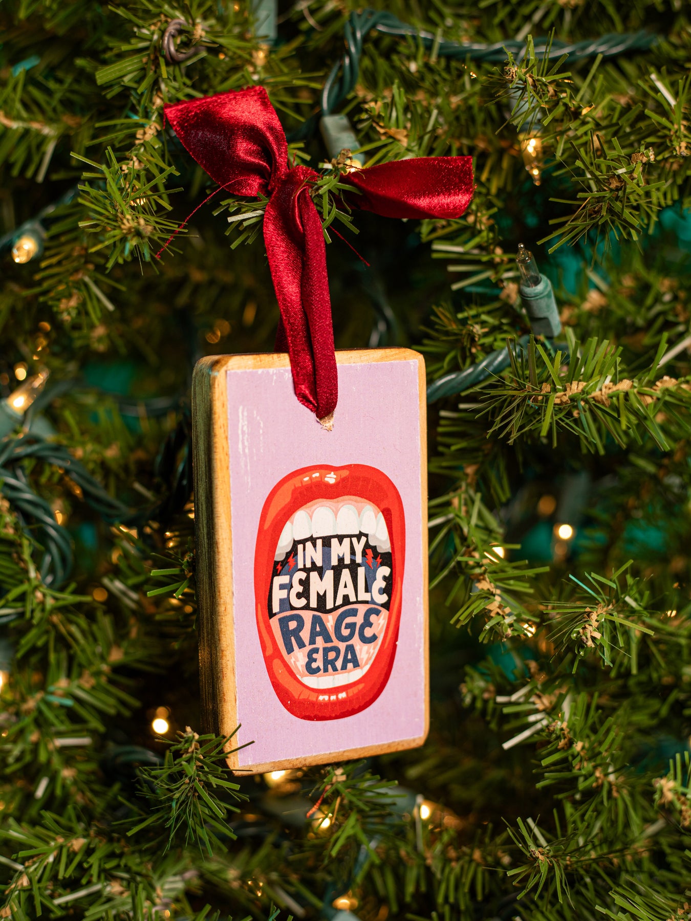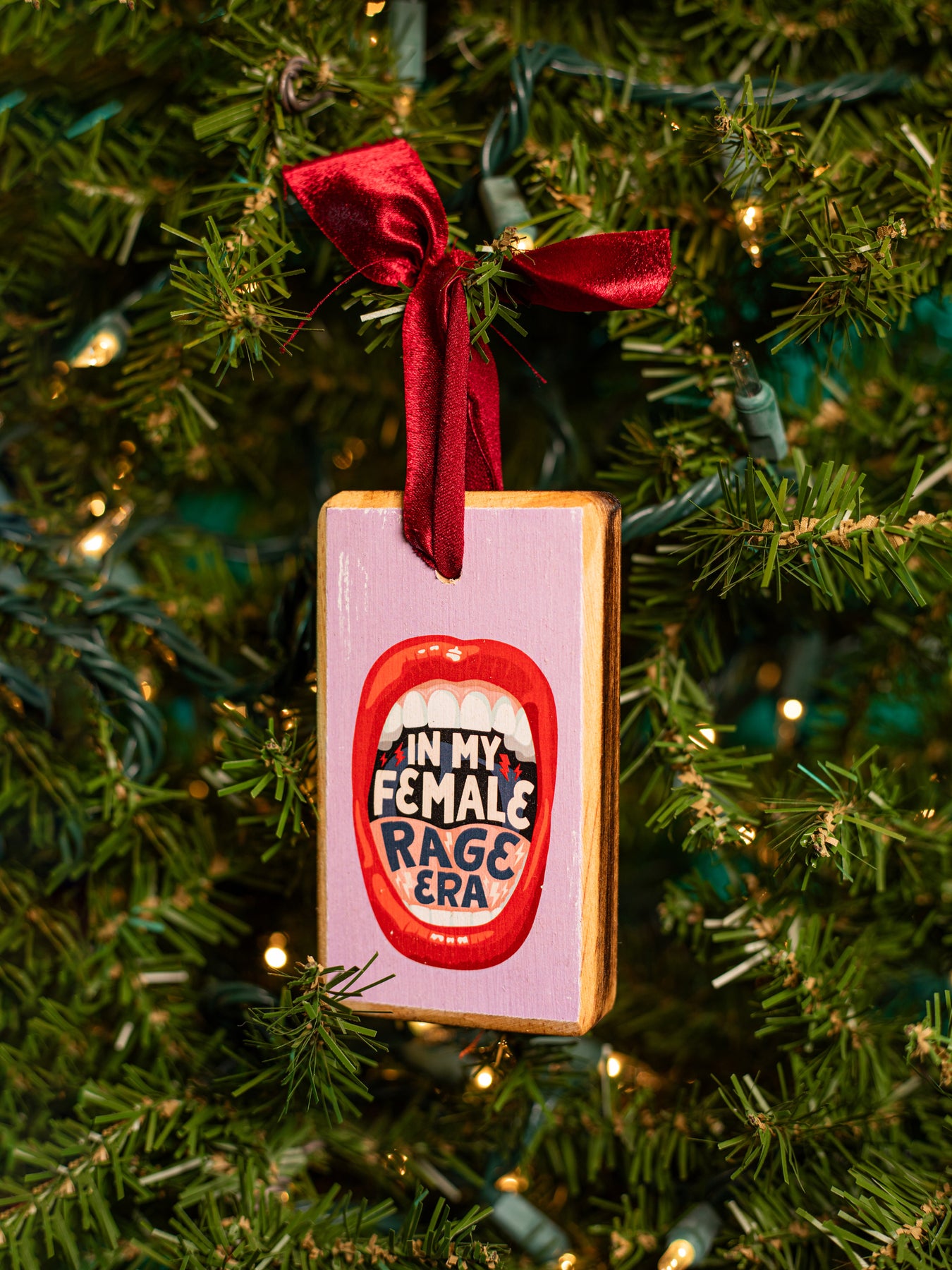 Handmade wood ornament featuring a woman's open mouth in protest with lettering inside "In my female rage era," this illustration captures the raw emotion and strength of the female voice during this era. Perfect stocking stuffer gift for feminists and those who believe in the power of art to inspire change.