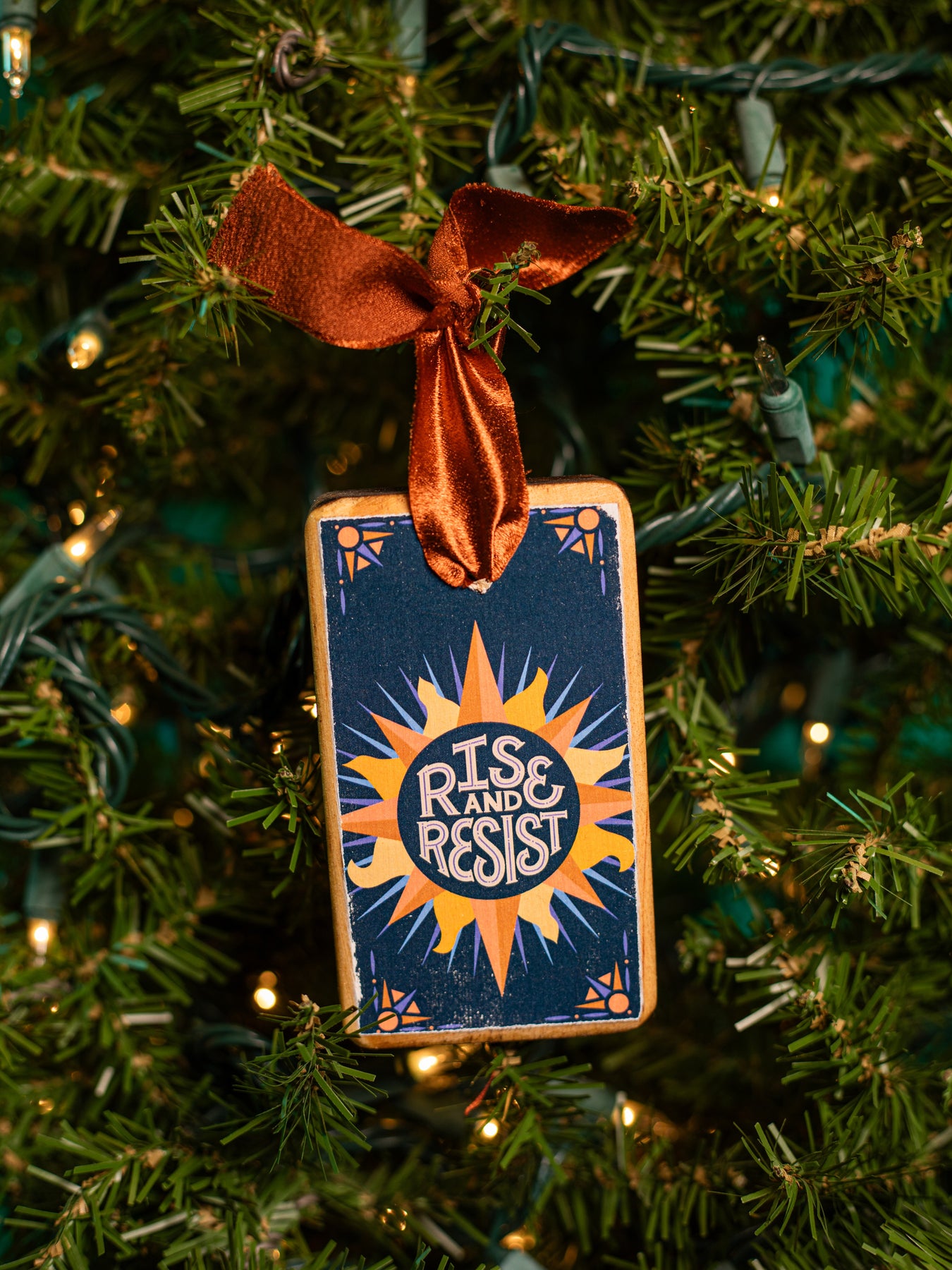 Handmade wood ornament with a post-election inspired illustration of the sun and a hand lettered saying, "rise and resist". A unique and meaningful addition to your Christmas decorations. Let this ornament serve as a reminder to stand up for what you believe in and never give up.