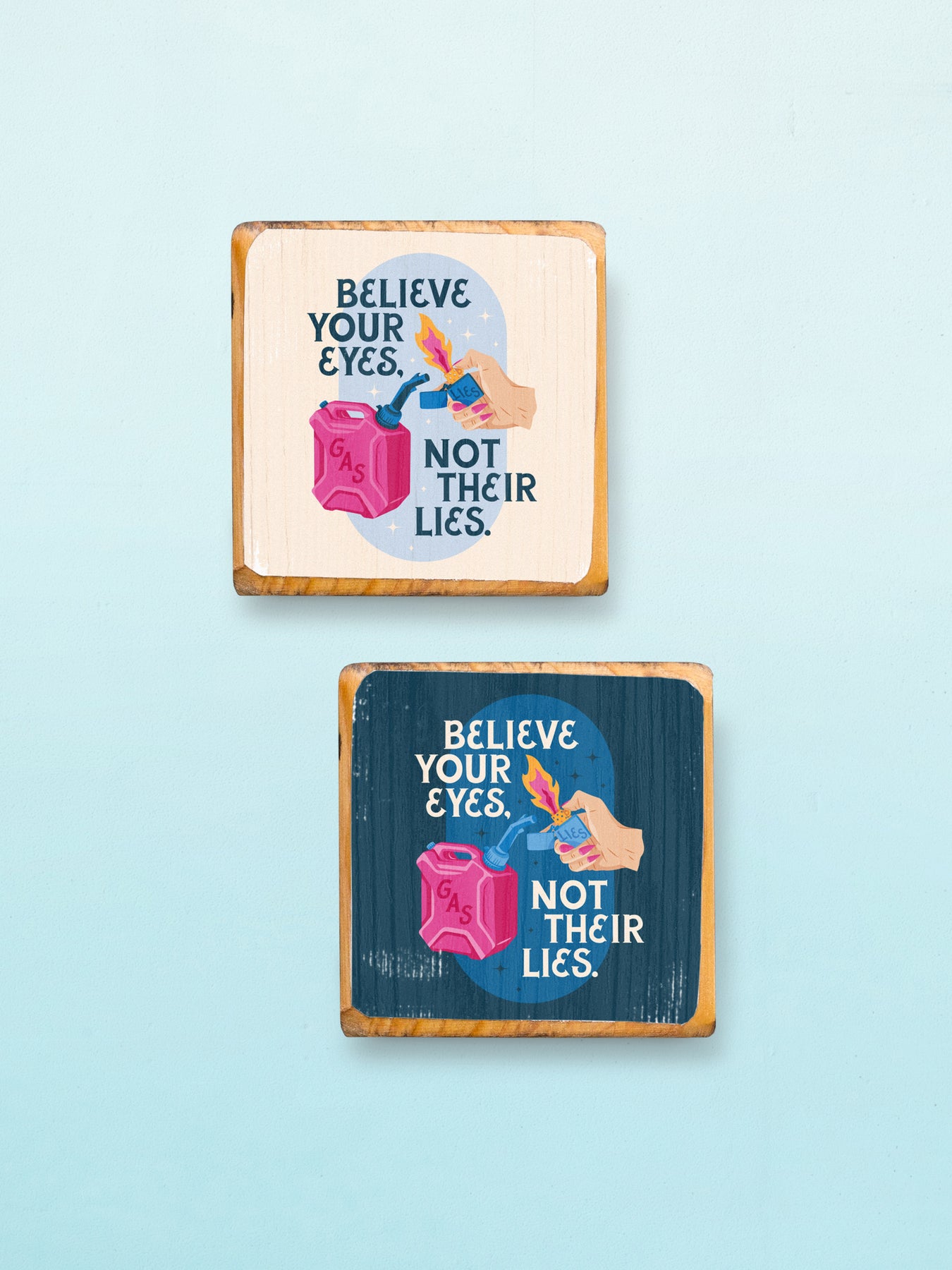 Wood wall sign featuring original illustration of a gas can beneath a hand holding a lit zippo lighter labeled with "lies." Includes bold hand-lettered message, "Believe your eyes, not their lies." Hang this protest series wall art on your wall as a daily reminder to not let this administration gaslight you with their continued lies and disinformation. Perfect for activists, artists and anyone ready to personalize their walls with intention.