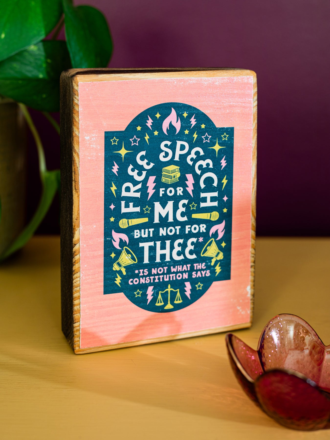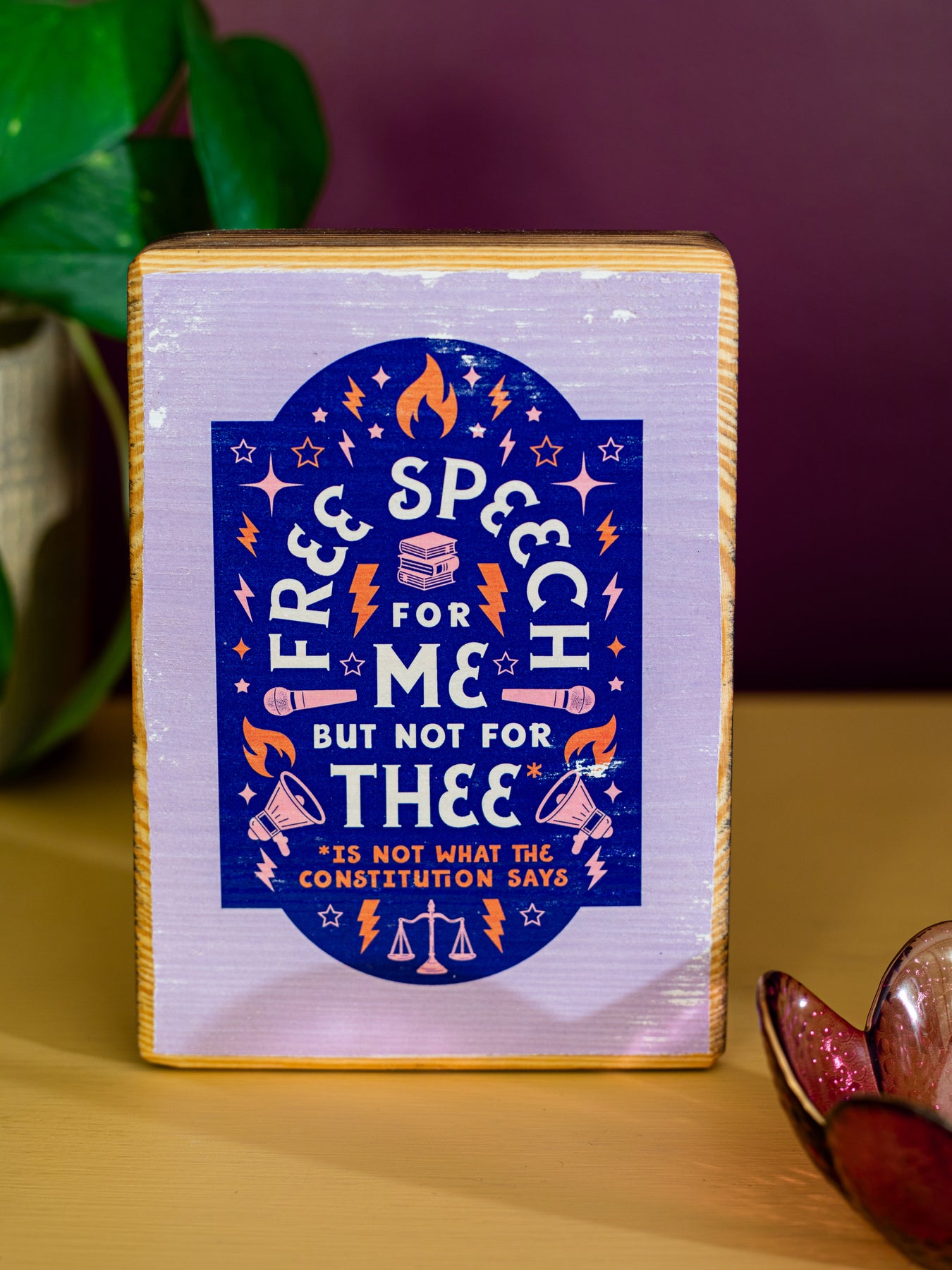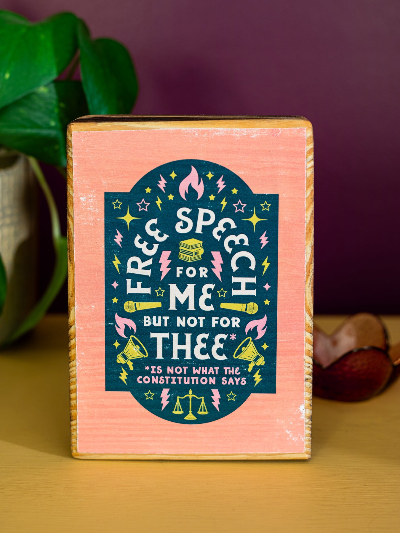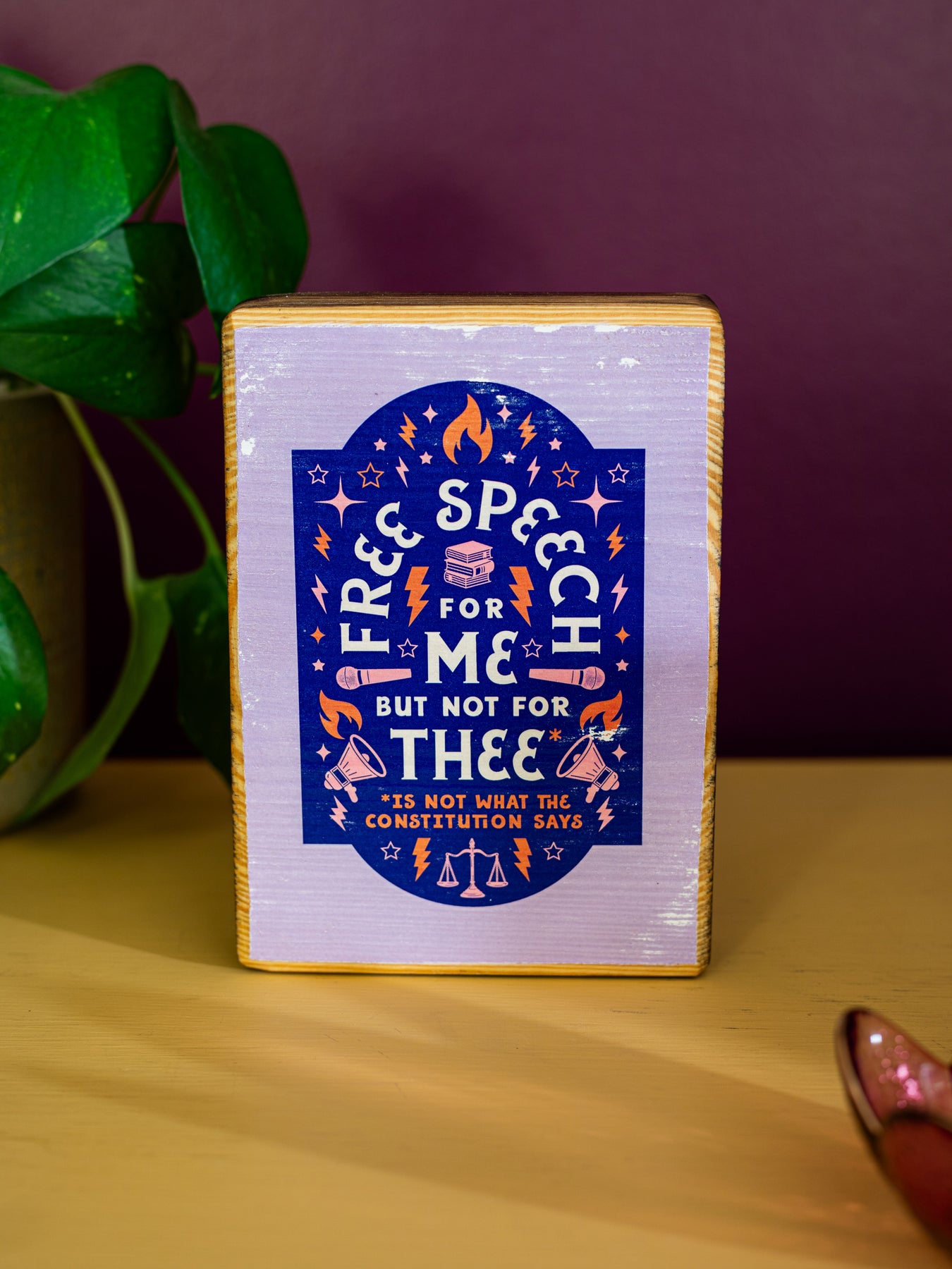 Wood wall sign featuring the phrase, "Free speech for me but not for thee* ... *is not what the constitution says," surrounding by illustrated symbols representing the freedom of speech. Makes the perfect home decor or gift for anyone fiercely defending the First Amendment as a right that belongs to all. Perfect wall art to celebrate freedoms for ALL.