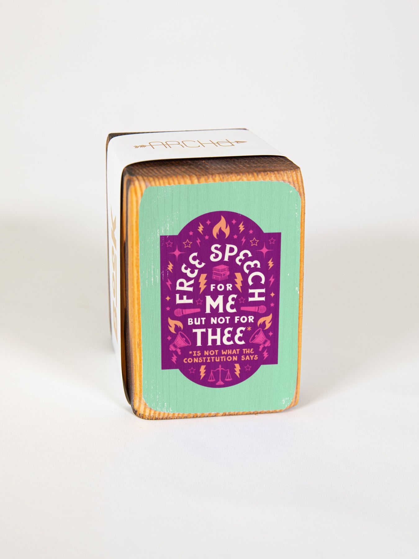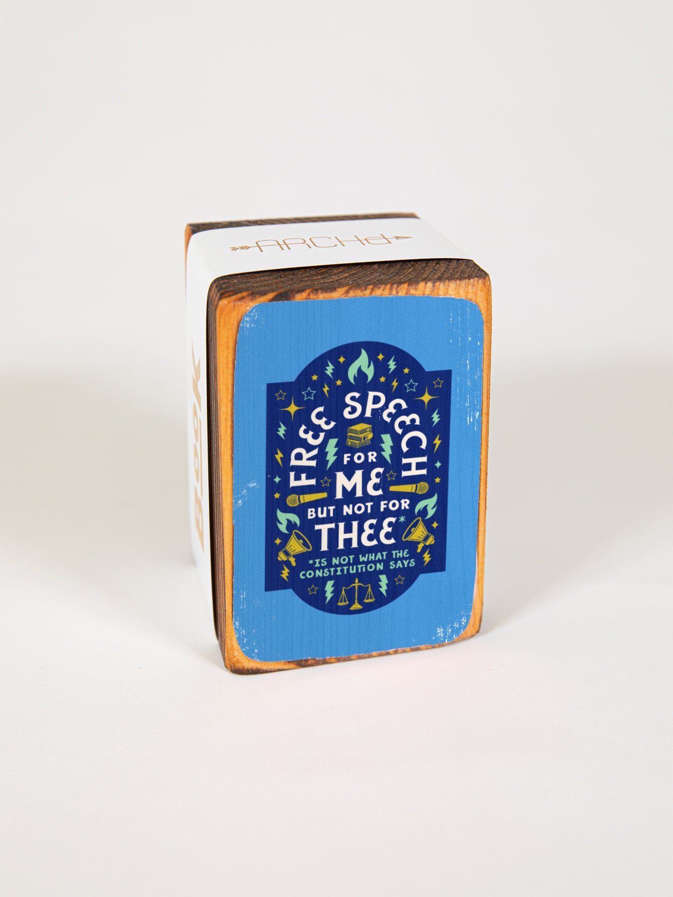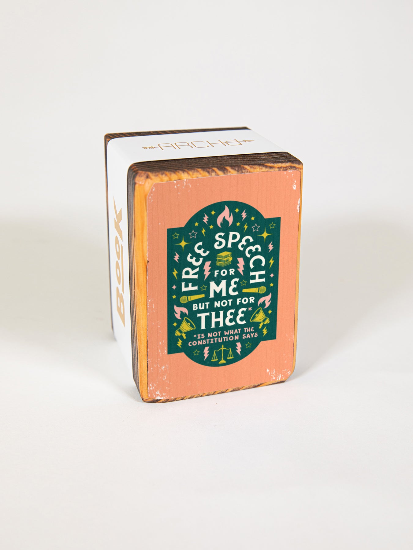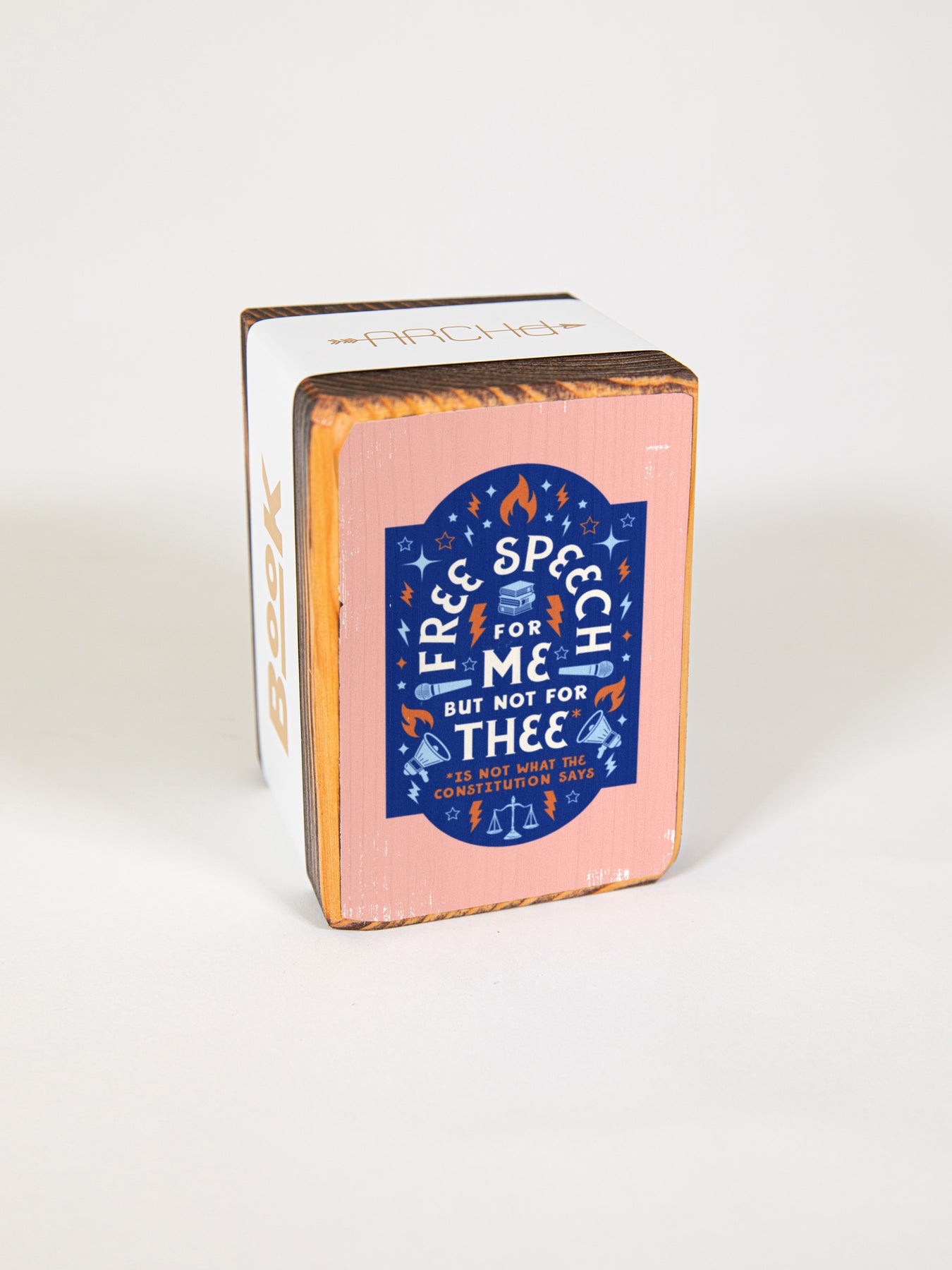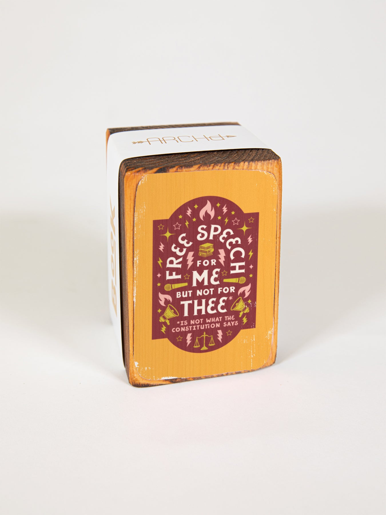 Single wood bookend featuring the phrase, "Free speech for me but not for thee* ... *is not what the constitution says," surrounding by illustrated symbols representing the freedom of speech. Makes the perfect home decor or gift for anyone fiercely defending the First Amendment as a right that belongs to all. Make your bookshelf a stand for liberty and justice with this striking wood bookend!