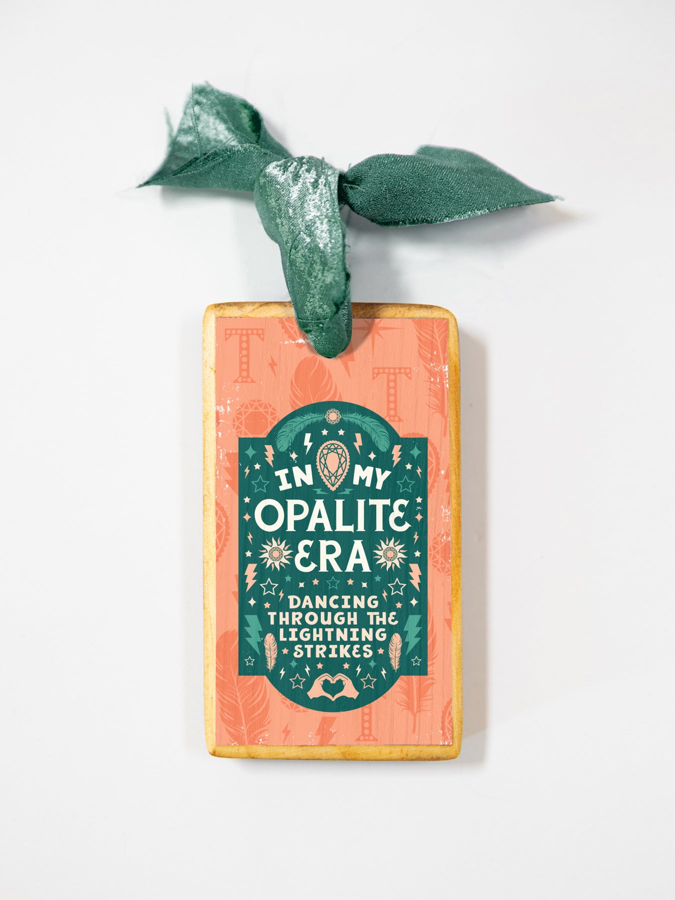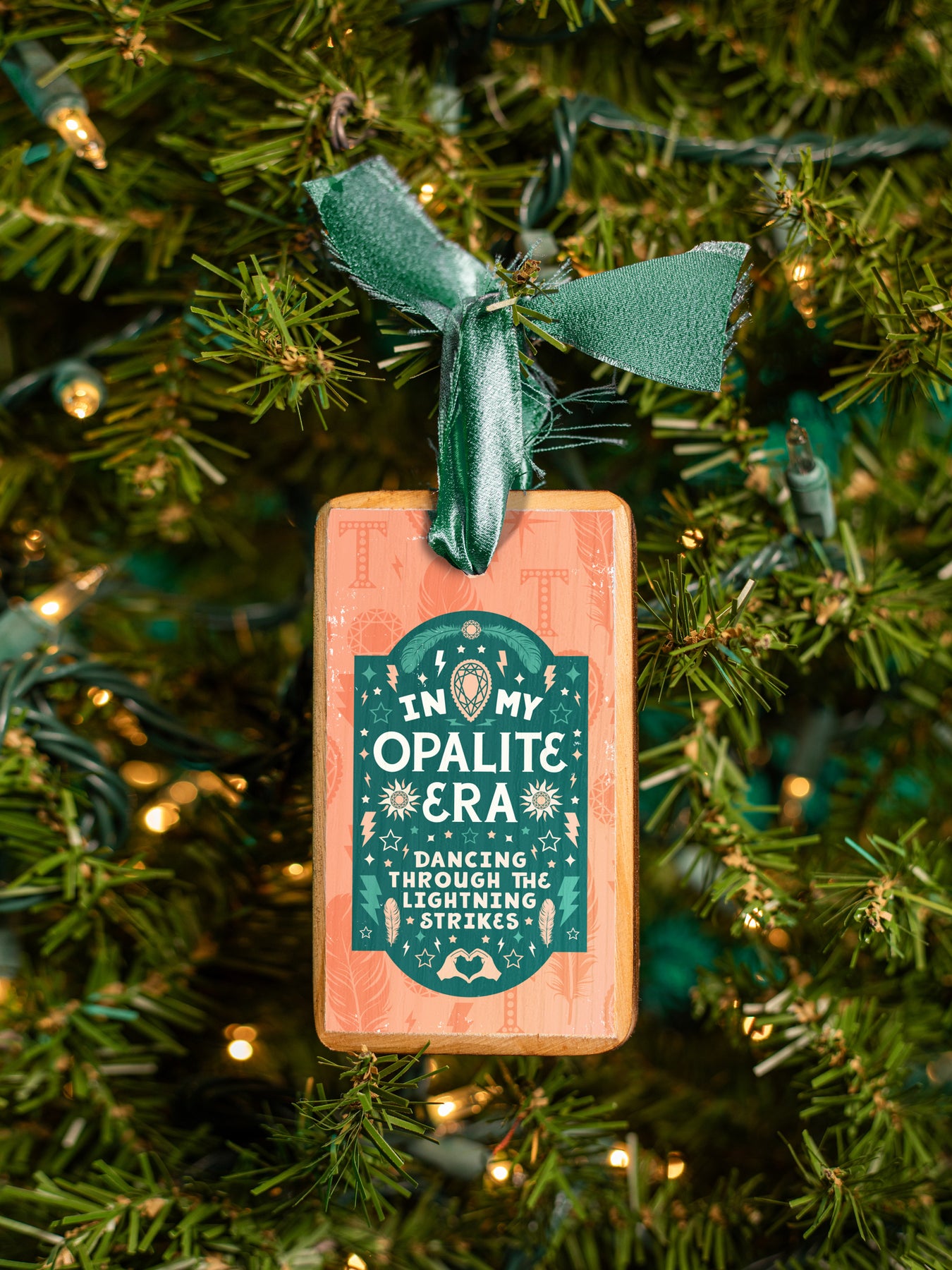 A Swifite Christmas ornament to celebrate Opalite, from Taylor Swift's The Life of a Showgirl album. Hand illustrated showgirl-themed icons, like gems, diamonds, a studded "T", feathers and lightning bolts, paired with the hand lettered saying, "In my opalite era. Dancing through the lightning strikes," all in green and orange hues. The perfect Swiftie merch for your taylor tree!