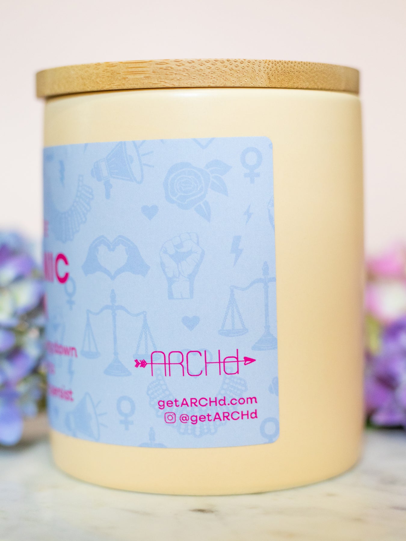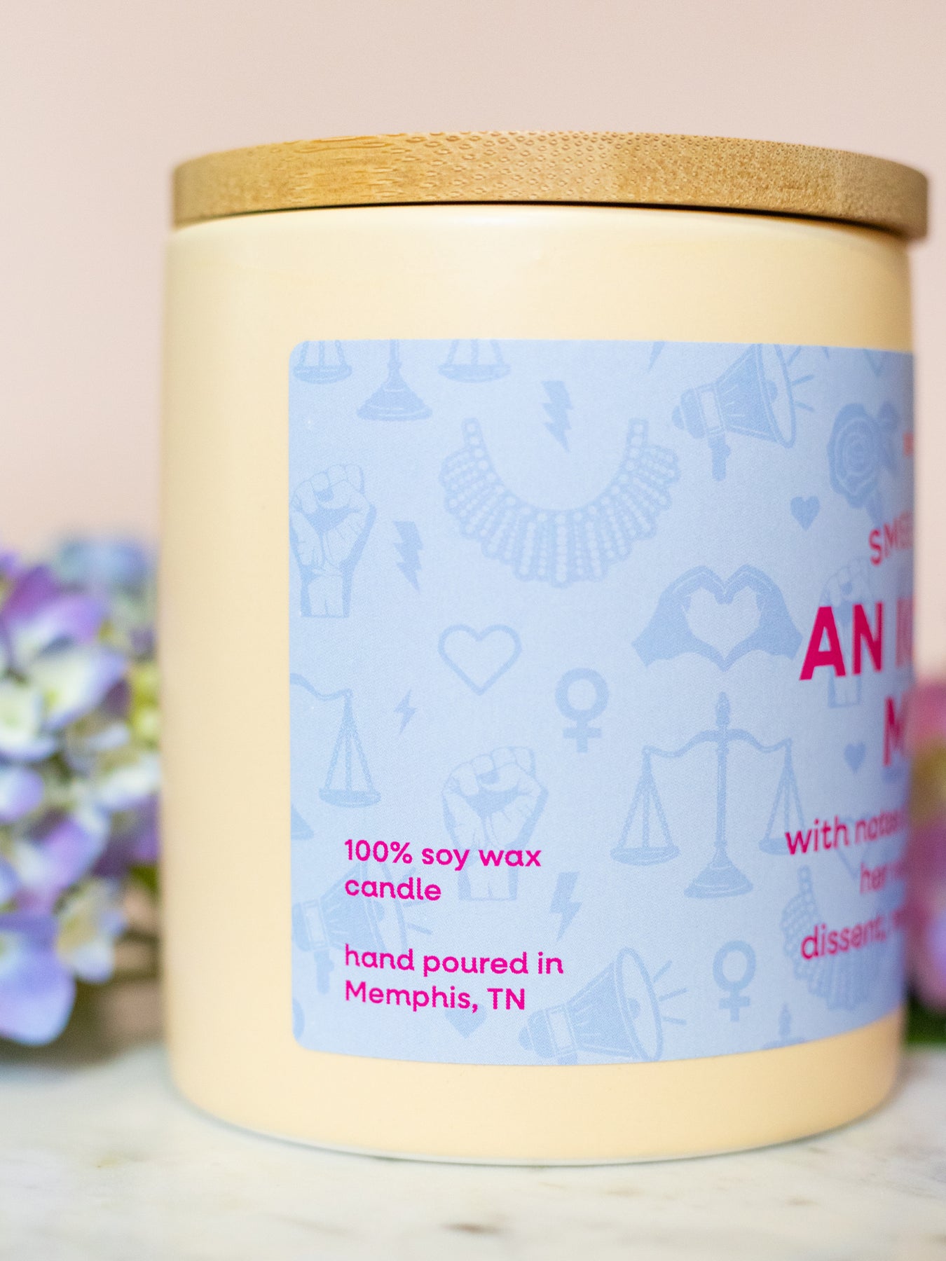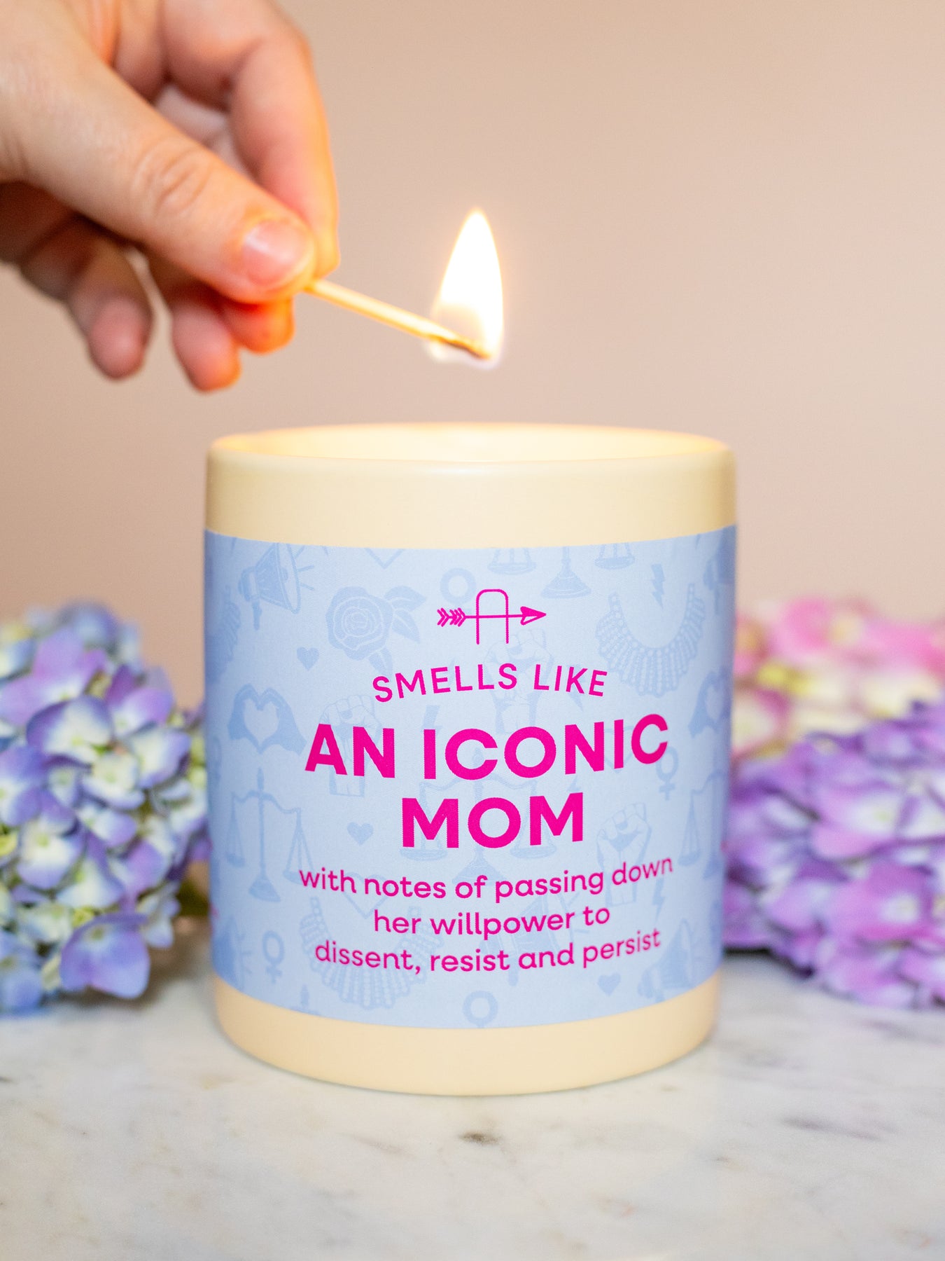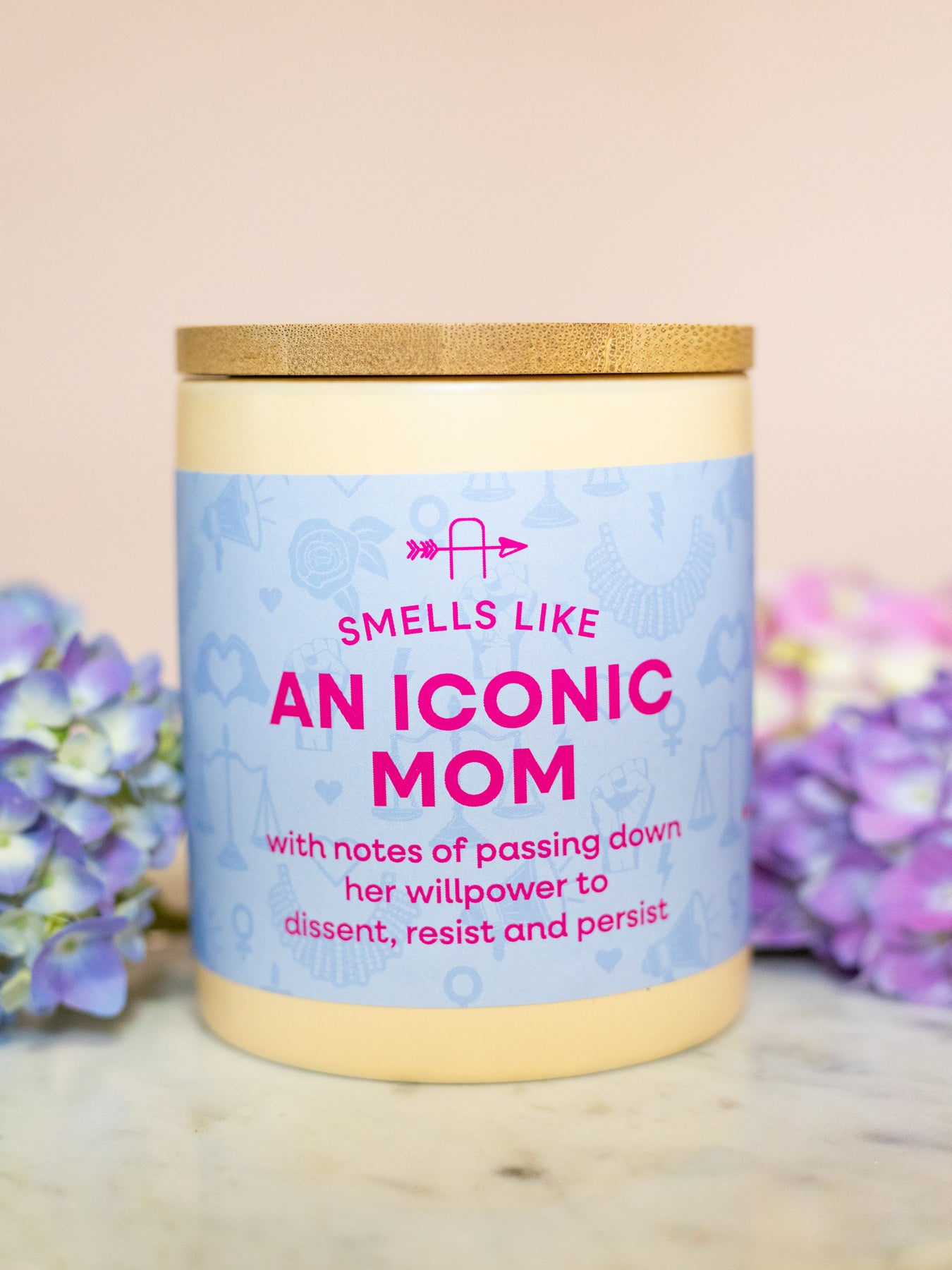 Smells Like An Iconic Mom candle, with notes of passing down her willpower to dissent, resist and persist. Adorned with a light blue label illustrated with megaphones, justice scales, raised fists, heart hands, flowers, hearts, female symbols and lightning bolts; housed in a light buttercream ceramic tumbler. It's the perfect Mother's Day gift for your feminist mom!